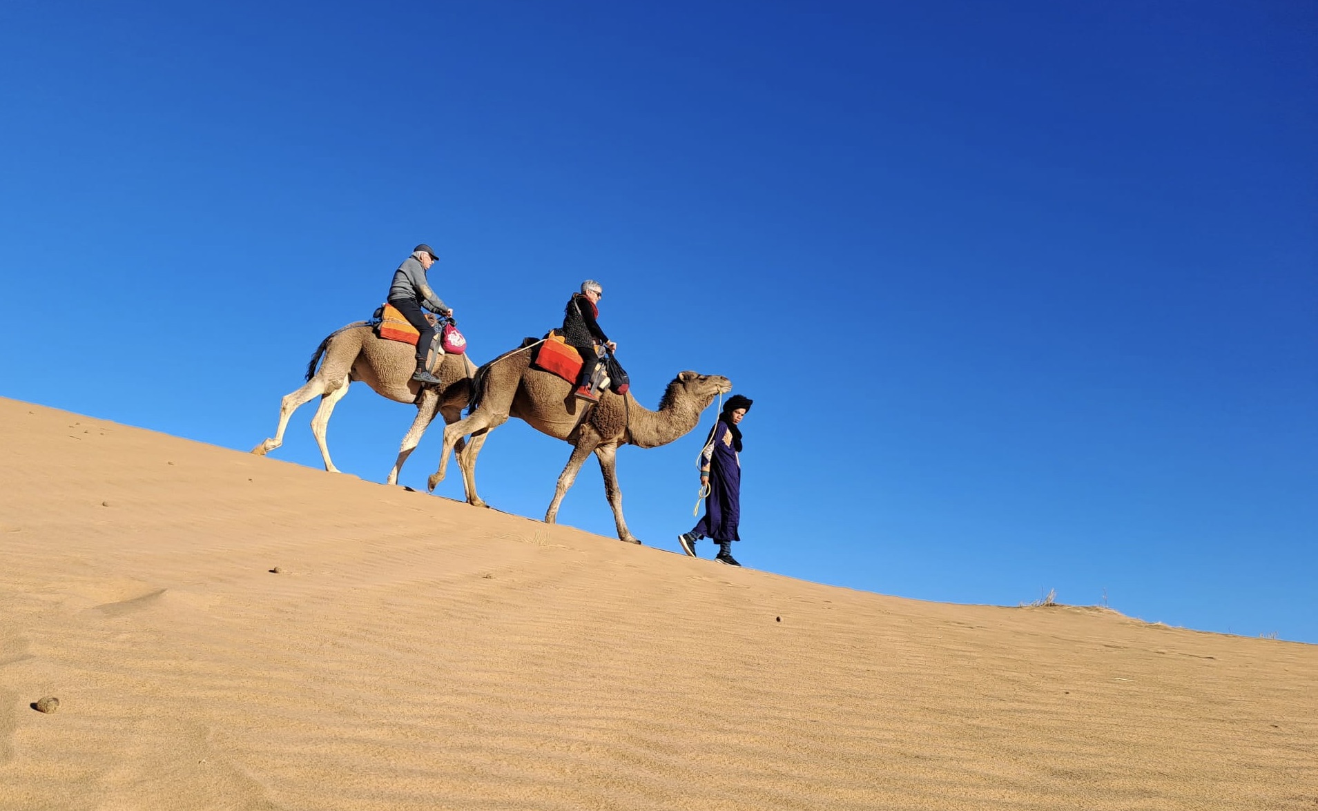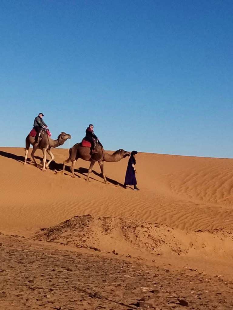 Riding camels in the Sahara